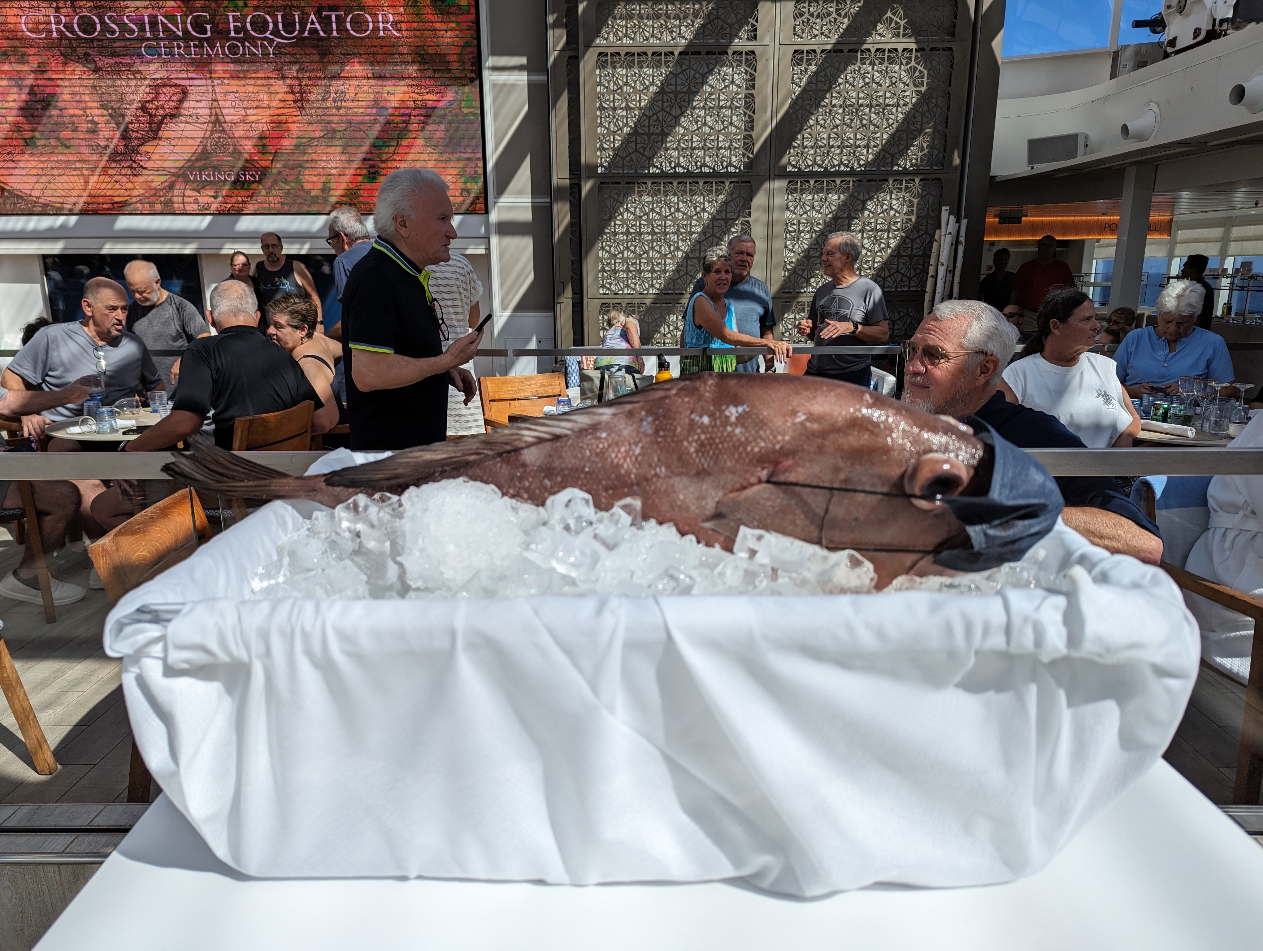 They call up the polliwogs by groups, they were suppose to kiss or salute the fish, their crimes were announced, silly things like the vocalist who work the least hours, our cabin attendants who made the beds so tight the travelers were unable to get out of their beds. The captain and lead staff then voted if they lived or died. Of course they all lived, but had to dunk in the ice water. It is all good fun.